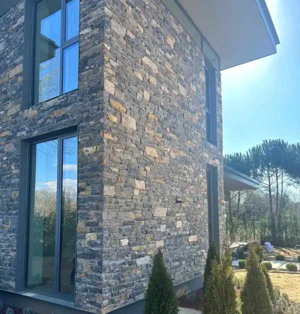Bu projede hem estetik hem de doğaya uyumlu bir görünüm elde etmek amacıyla, doğal dokusunu koruyan ve her biri özenle seçilmiş kırma kayrak taşları kullanıldı. El işçiliği ile uygulanan kaplama sayesinde villa, çevresiyle bütünleşen, özgün ve kalıcı bir mimari kimlik kazandı.